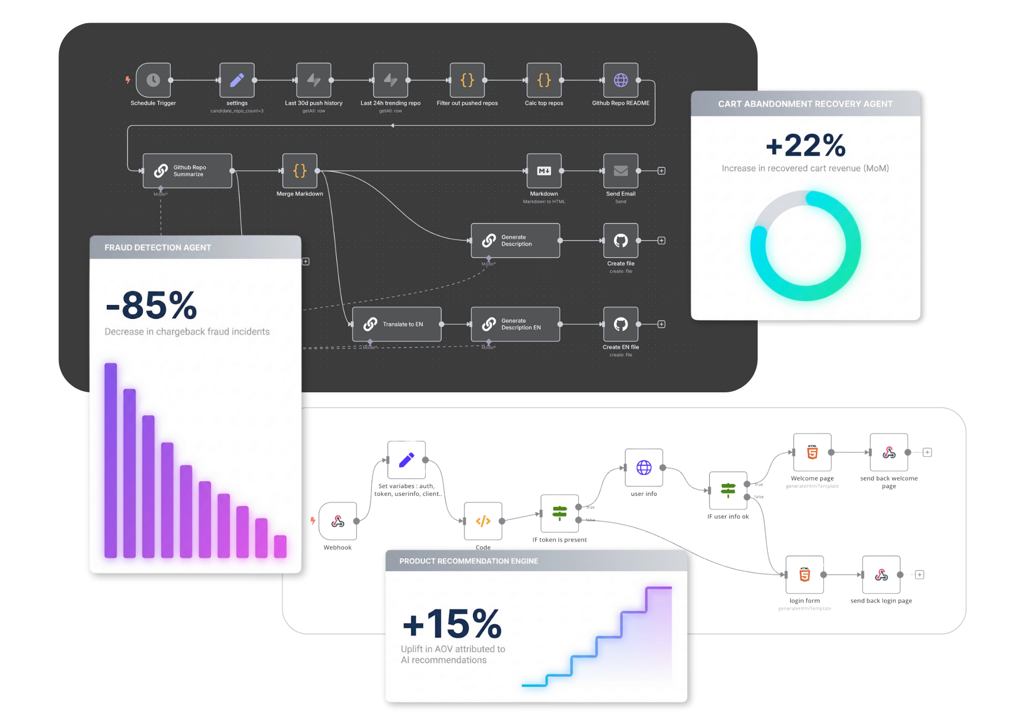 Triggered email/SMS campaigns with dynamic product insertion and discount code generation.